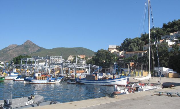Sur la gauche de la photo, les strutures métalliques sont le début de la construction d'une criée. En arrivant , sur bâbord, beaucoup de chalutiers sont sur corps-mort.